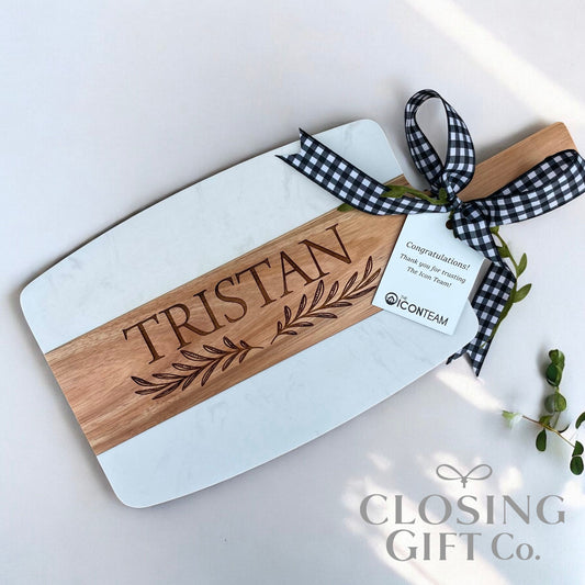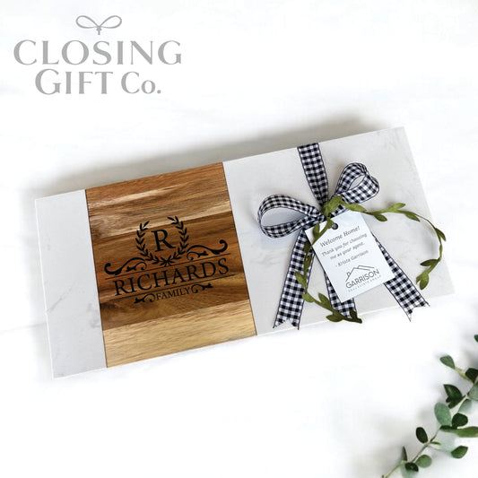 Our closing gift baskets and gift sets often include popular items like personalized cutting boards, engraved charcuterie boards, drinkware, coasters, and other home essentials that clients can enjoy long after move-in day. Many real estate agents choose gift baskets because they double as meaningful housewarming gifts that help new homeowners settle into their space.