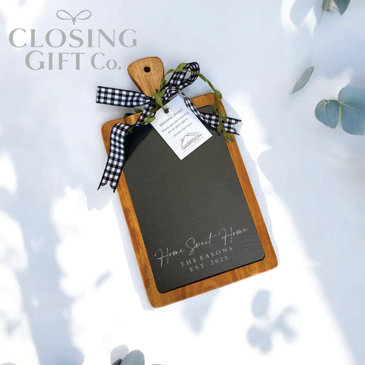 Realtor Closing Gift Basket | Housewarming Gift for New Home | Engraved Acacia & Slate Cutting Board, Coasters & 20oz Tumblers