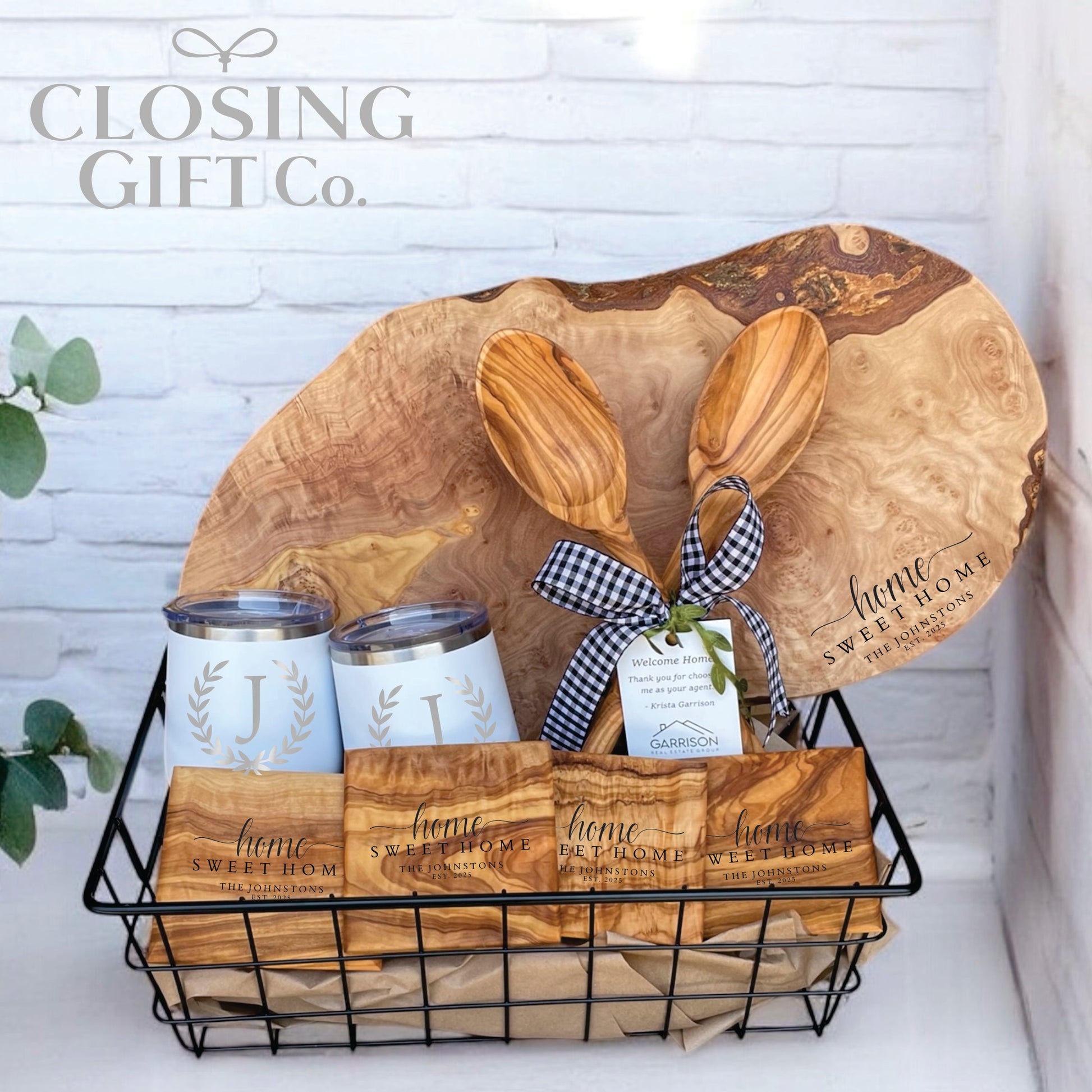 Option 1: Olive Wood Charcuterie Board + Olive Wood Coaster Set of 4 + 2 Olive Wood Serving Spoons + 2 Wine Tumblers + Basket for easy gifting.